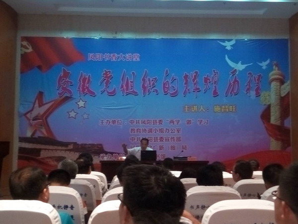 7月6日下午,鳳陽縣書香大講堂系列之“安徽黨組織的輝煌歷程”在縣圖書館報(bào)告廳舉行,鳳陽縣公司派員聆聽。講座由省委黨史研究室副主任施昌旺主講。縣委“兩學(xué)一做”學(xué)習(xí)教育協(xié)調(diào)小組辦公室、縣委宣傳部、縣委講師組、縣文廣新(旅)局、縣圖書館相關(guān)負(fù)責(zé)人以及縣直各部門黨員干部聆聽了講座。